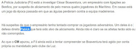 A capa do pasquim da Cofina no final é um pormenor muito interessante. A intenção é valorizar artificialmente o jogador - além de, obviamente, vender papel à lampionagem mais boçal - por intermédio de um processo semelhante à da muito celebre e pouco depois desmascarada notícia de "Guardiola na Luz para ver Grimaldo" e levar otários um pouco por essa Europa fora a pensar "se o Boifica está interessado é porque ele deve ser bom", a seguir mandam olheiros, etc.